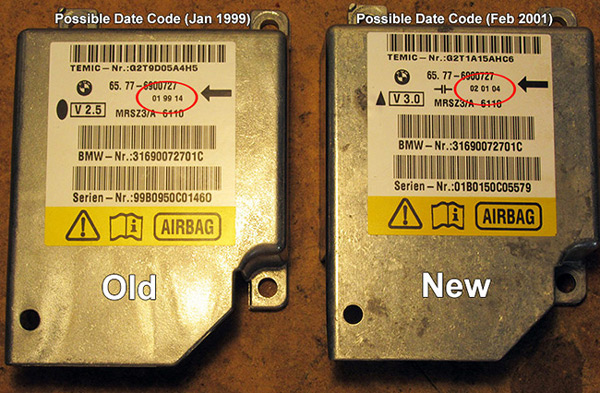 SRS modules may have date codes on their lables (circled in red above), helping to distinguish newer versions of the same part number. Note also the "V" codes (beneath BMW logo). Modules with "V 2.5" are specifically problematic.